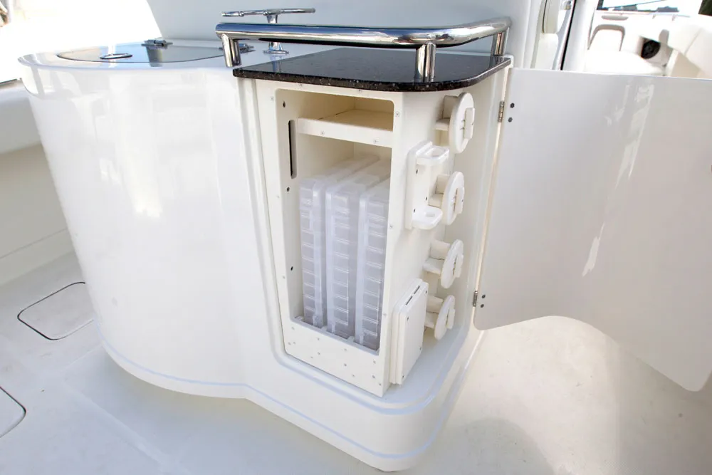 • Insulated, lockable 355-quart port and starboard floor fish boxes with diaphragm pumps; each can alternately store 4 rods or a 5-gallon bucket
