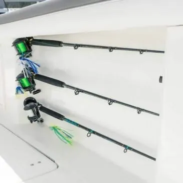 • Port and starboard lockable rod storage compartments to accommodate 3 offshore rods per side