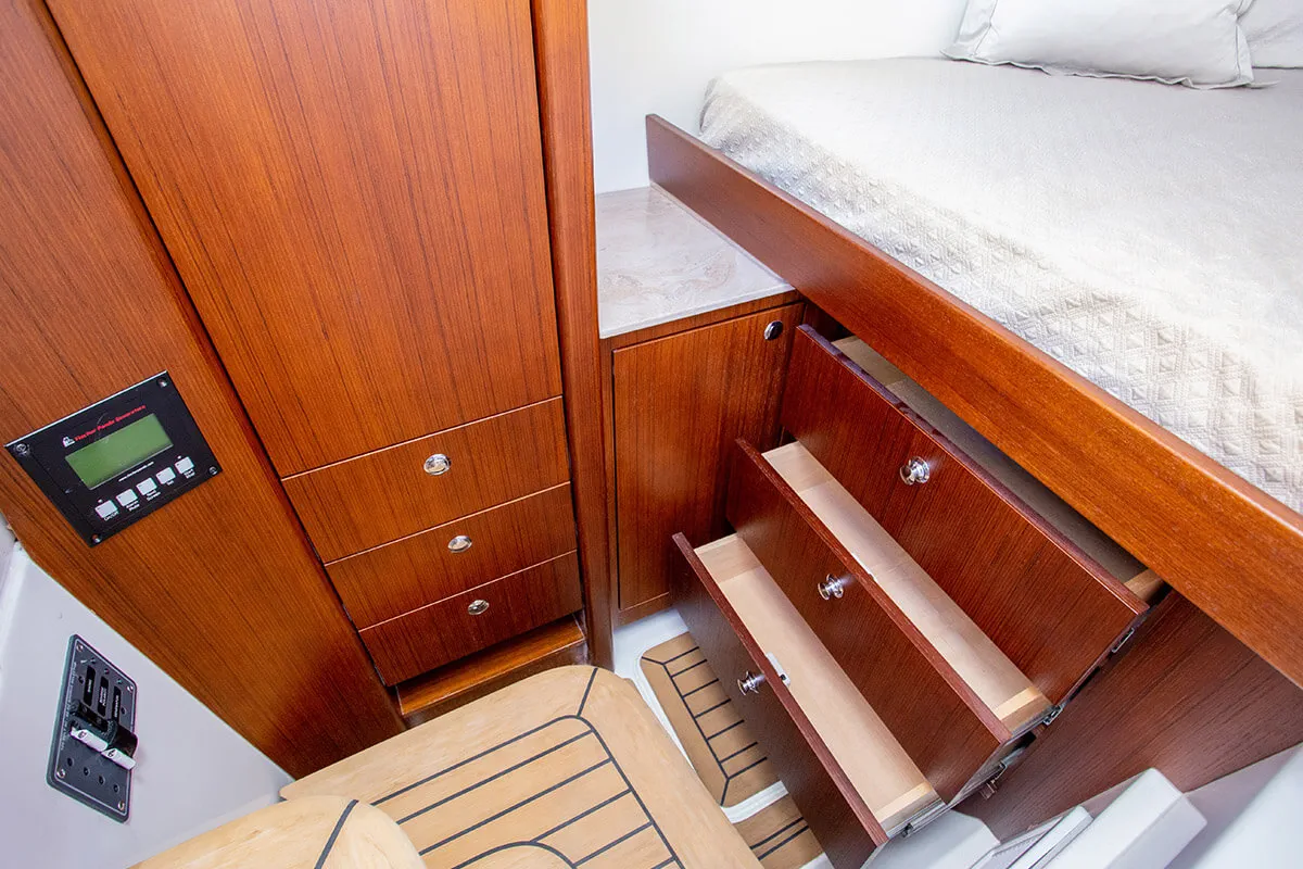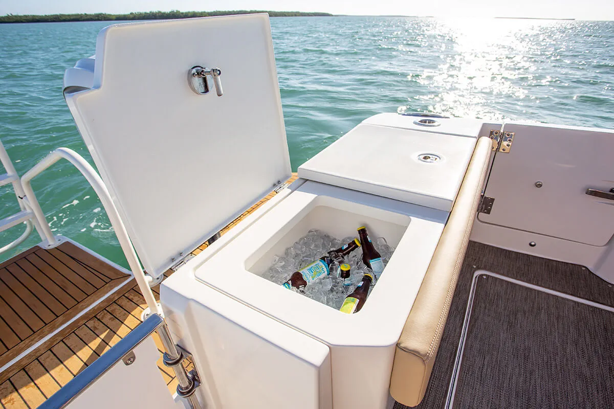 • Entertainment center drawer refrigerator, storage drawers and aft facing seating with insulated storage underneath