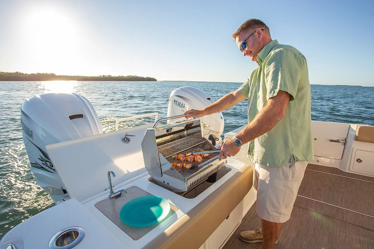 • Starboard side transom insert module with sink, cutting board, electric grill and drawer refrigerator