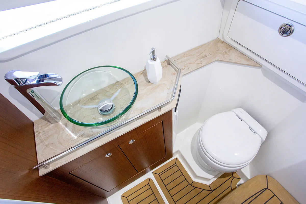 • Shower sump molded into fiberglass pan, macerator/holding tank access under shower seat