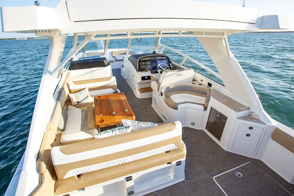 • Forward and aft cushioned side wall inserts with drink holders, power outlets and grab rails