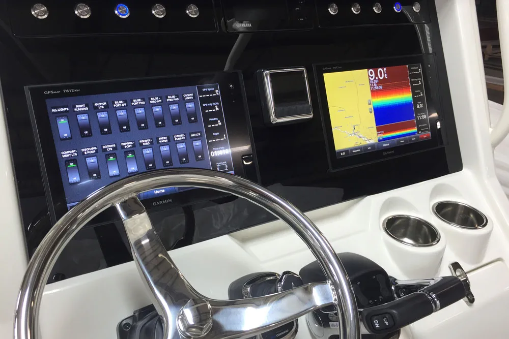 • Glass dash console with standard Garmin GPSMAP® 7612xsv 12-inch multi-touch widescreen display with Airmar® B117 depth/temp thru-hull transducer