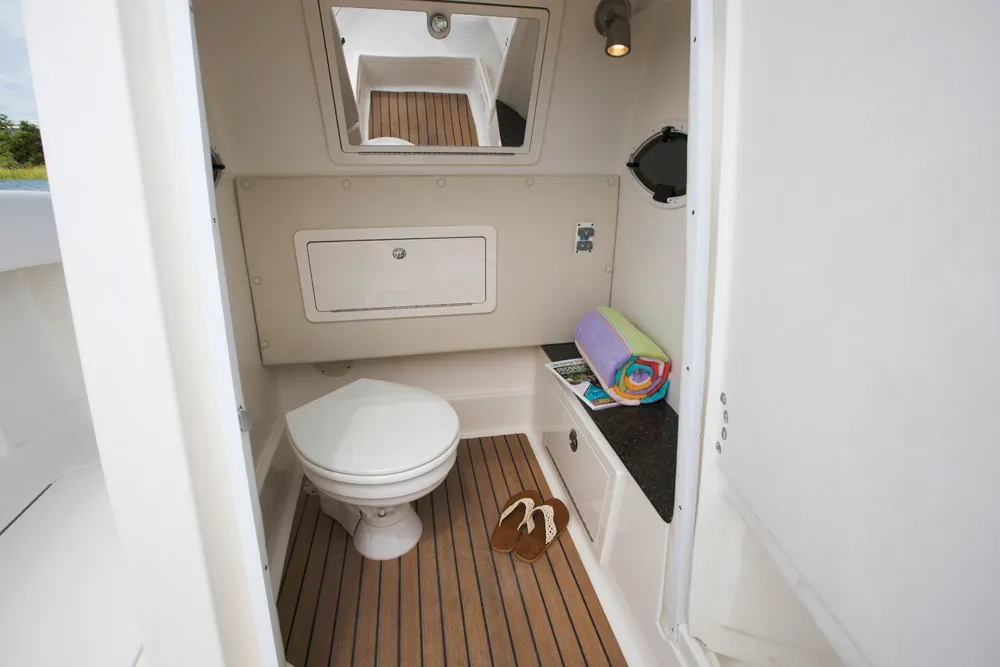• Head includes Corian® counter, mirror and toiletries storage. Forward-facing wide console door for easy head access.
