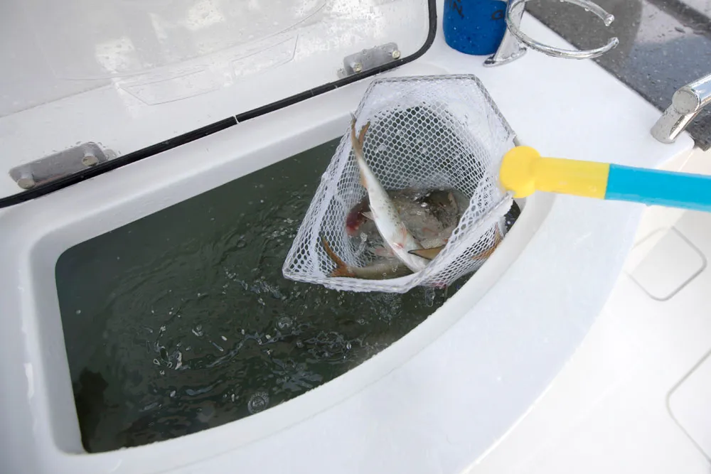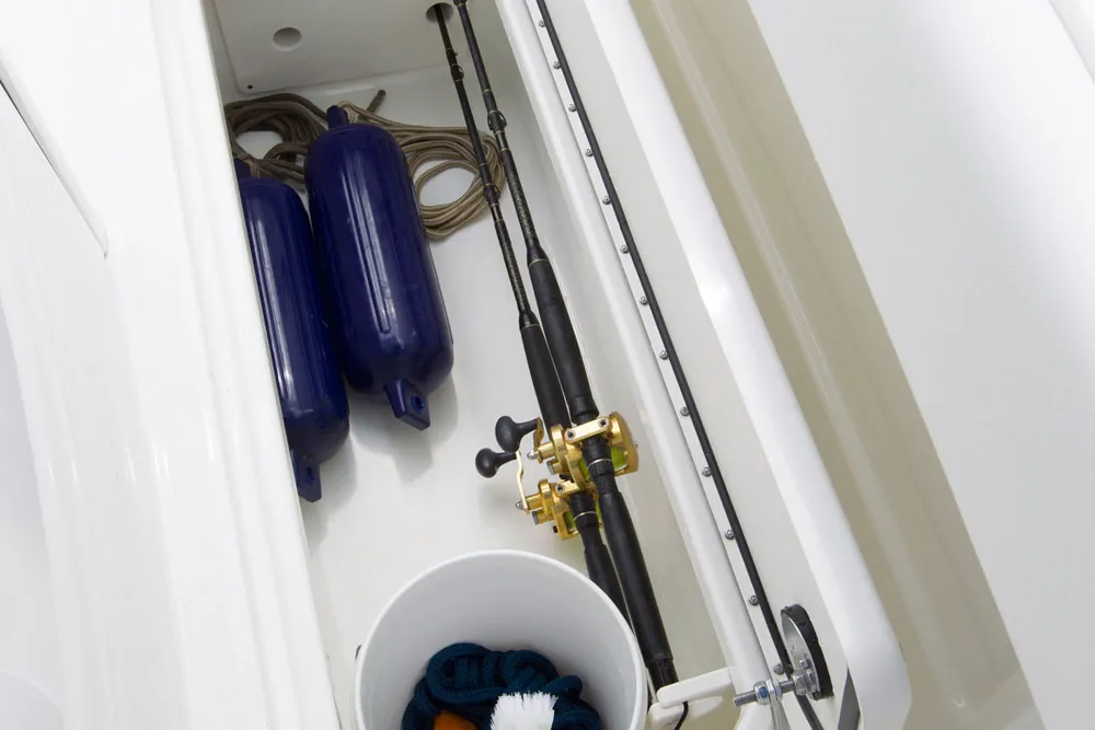 • Insulated, lockable 355-quart port and starboard floor fish boxes with diaphragm pumps; each can alternately store 4 rods or a 5-gallon bucket