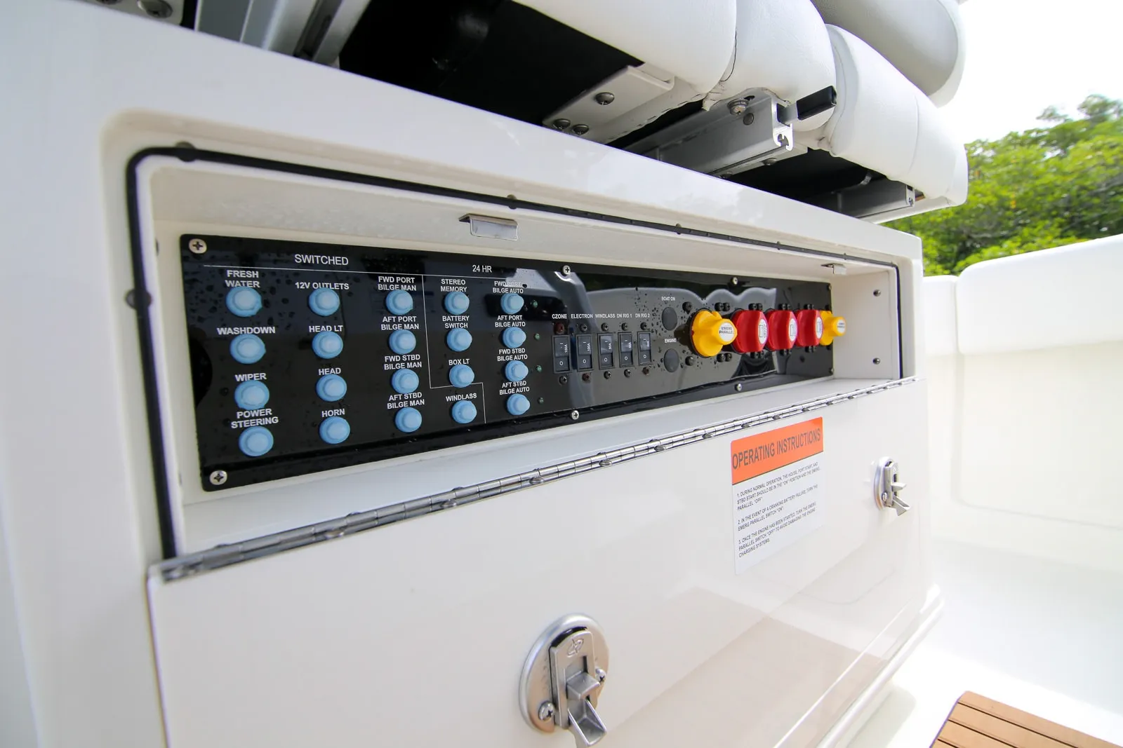 • Battery management center for 3 batteries and battery select switches with parallel capability, power assist pump access and fire extinguisher compartment; integrated toe rail