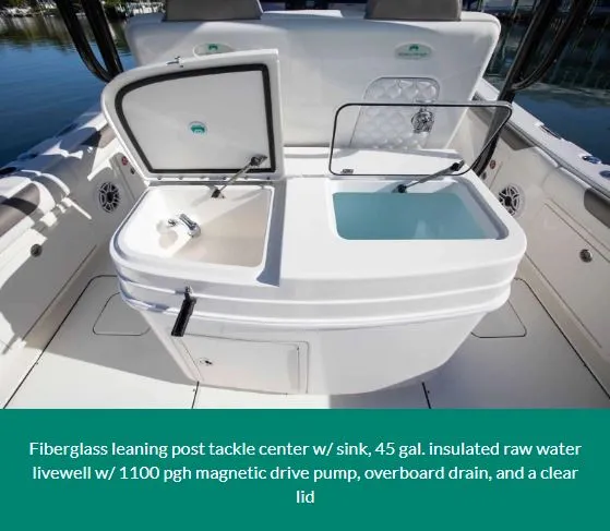 • Fiberglass leaning post tackle center with sink, 45-gallon insulated, raw water livewell with 1100-GPH magnetic drive pump, overboard drain, and a clear lid