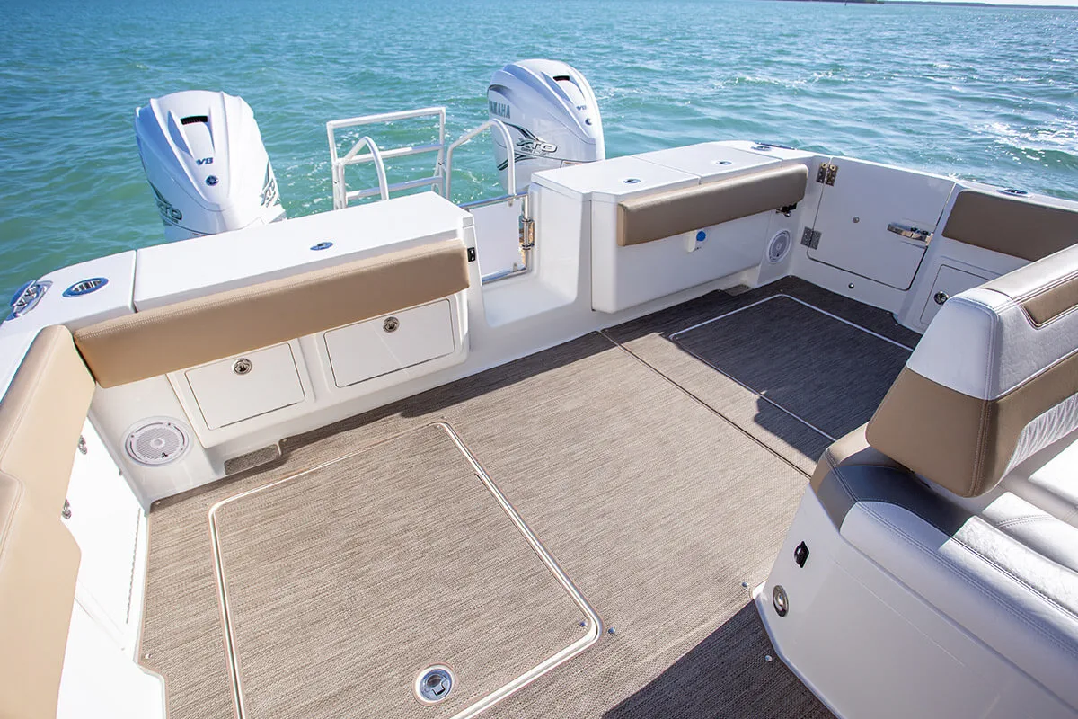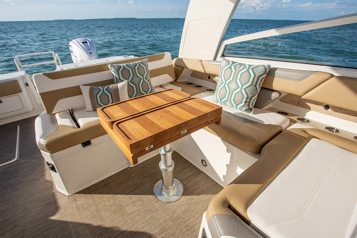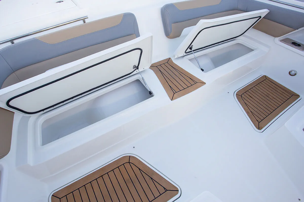 • Hull side storage port and starboard cushion close outs with cup holders and 12V DC ports in side compartments